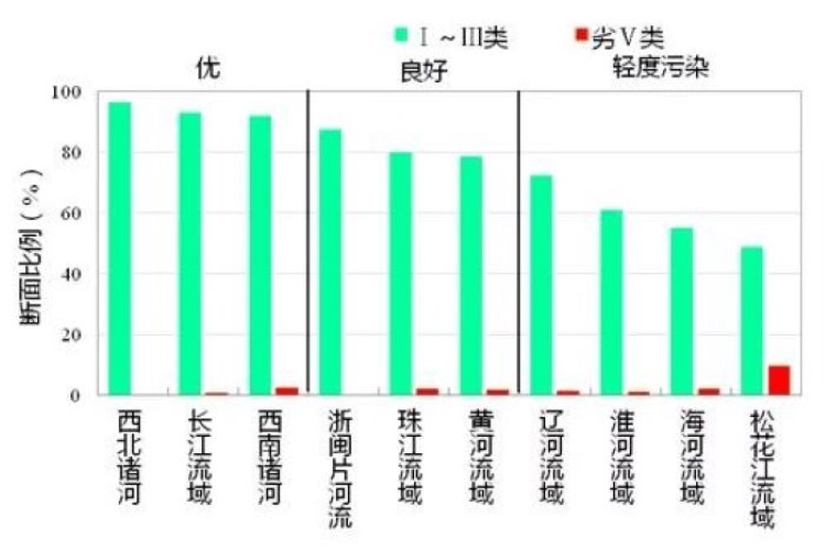 1-6月,长江、黄河、珠江、松花江、淮河、海河、辽河等七大流域及西北诸河、西南诸河和浙闽片河流水质优良(Ⅰ~Ⅲ类)断面比例为83.5%,同比上升1.3个百分点;劣Ⅴ类断面比例为1.8%,同比下降0.8个百分点。主要污染指标为化学需氧量、高锰酸盐指数和五日生化需氧量。其中,西北和西南诸河、长江流域和浙闽片河流水质为优;珠江、辽河、黄河和淮河流域水质良好;海河和松花江流域为轻度污染。